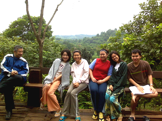 Faculty and staff sitting on the deck at the retreat. From left to right are: Dr. Soree Pokaeo (Counseling Psychology), Thip, June, Or, Fon, and Bug. These are all nicknames, which Thais use so that others can pronounce their names! |