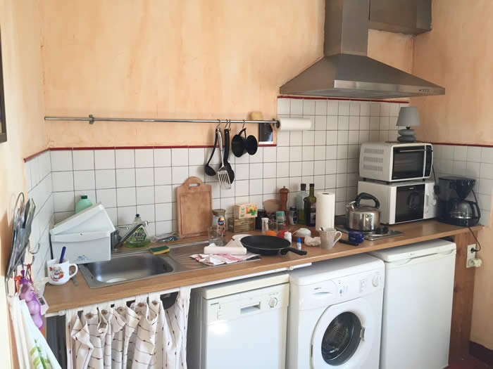 Our kitchen. It had a small refrigerator (far right), clothes washer (middle), and a dishwasher (which we never used). It lacked a dryer. We prepared many, many meals here using fresh, local food. An outdoor market consisting of several food trucks was open every Wednesday until 7:00 p.m. selling excellent vegatables, poultry, meat, and cheese. |